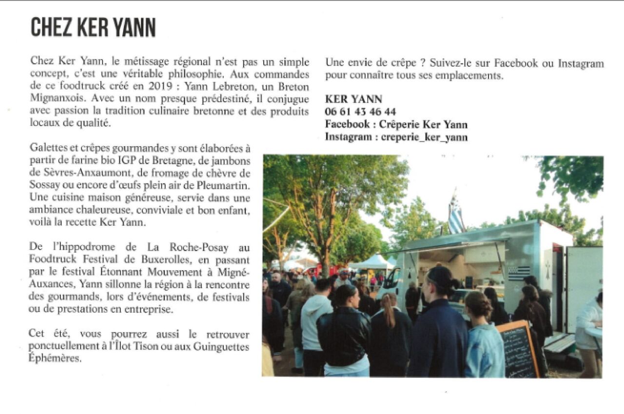 Ker Yann en bon Foodtruck breton se déplace dans toute la région poitevine avec sa bonne humeur et son sens de l’humour. Distributeur officiel d’ambiance chaleureuse et conviviale, n’hésitez pas à demander des renseignements, commander, faire dresser un devis. Ker Yann saura s’adapter à vos envies.